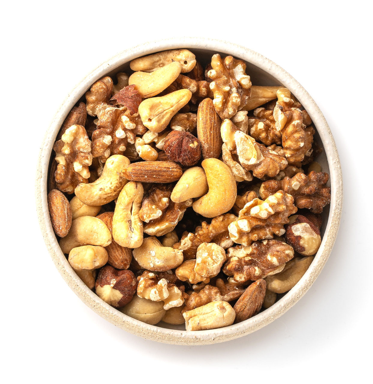 Geröstete Walnuss- (30%, Ostschweiz konventionell) und Haselnusskerne (20%, IT), gemischt mit je 25% gerösteten und gesalzenen Cashewnüssen und Mandeln internationaler Herkunft, geröstet in der Schweiz.